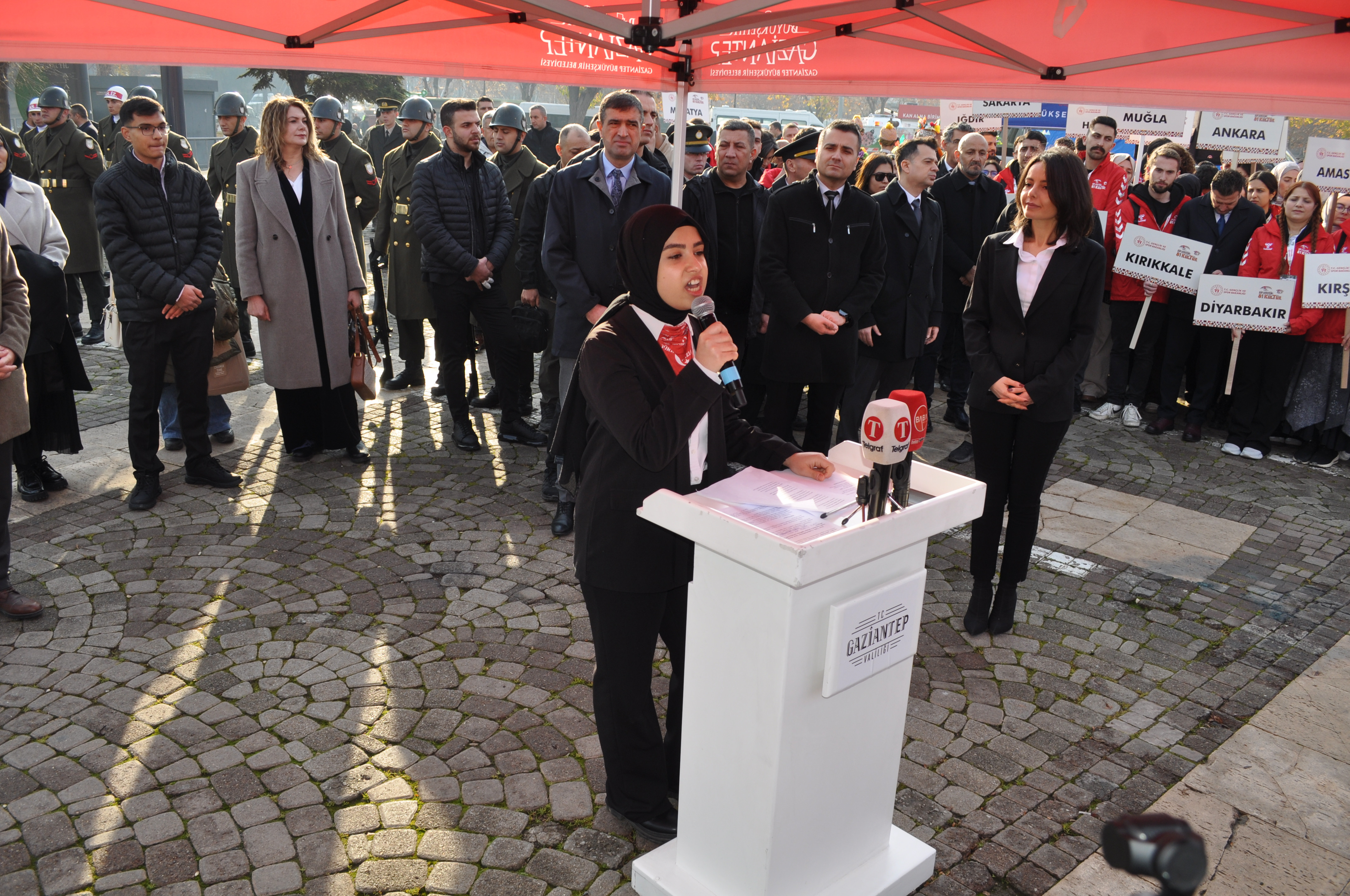 Gaziantep üniversitesi Mavera salonunda devam eden Törene, Vali Kemal Çeber, Büyükşehir Belediye Başkanı Fatma Şahin, Gençlik ve Spor Bakanı Osman Aşkın Bak.Garnizon Komutanı Tümgeneral Fethi Oltulu, İl Jandarma Komutanı Tümgeneral Halil Şen, İl Emniyet Müdürü Celal Özcan, Şahinbey Belediye Başkanı Mehmet Tahmazoğlu, Şehitkamil Belediye Başkanı Umut Yılmaz, AK Parti Gaziantep Milletvekili Derya Bakbak, MHP Gaziantep Milletvekili Sermet Atay,Ak Parti Milletvekillerinden Bünyamin Bozgeyik, irfan Çelikaslan, Oğuzeli Belediye Başkanı Bekir Öztekin, GAÜN Rektörü Sait Mesut Doğan, GİBTÜ Rektörü Şehmus Demir,HKÜ Rektör vekili Gül Rengin Küçükerdoğan, SANKO Üniversitesi Rektörü Güner Dağlı,Şehit ve Gazi aileleri,Sivil Toplum Kuruluşları,Siyasi parti temsilcileri, öğretim görevleri, Sporcular, Her alanda başarılı olan Gaziantep'e Değer katanlar vatandaşlarımız programa katıldılar.
