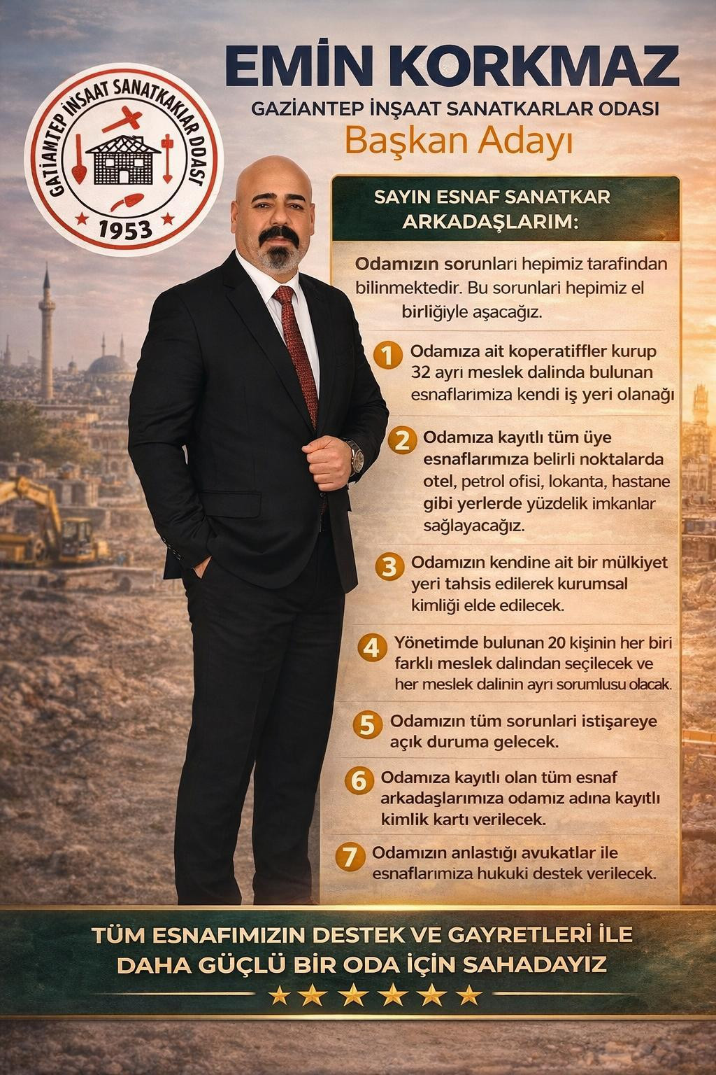 Gaziantep İnşaat Sanatkarlar Odası Başkan Adayı Emin Korkmaz dan önemli açıklamalar