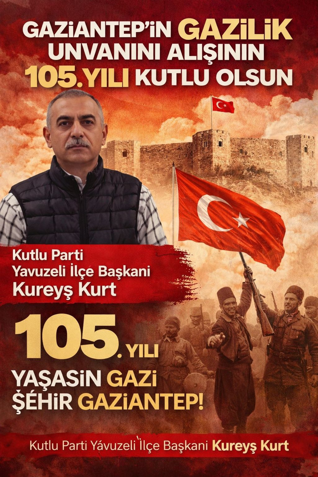 Kutlu Parti Yavuzeli İlçe Başkanı Kureyş Kurt, Gaziantep'imizin GAZİ'lik verilişinin bu önemli gününde Şehitlerimizi rahmetle, Gazilerimizi minnetle ve şükranla anıyorum.
