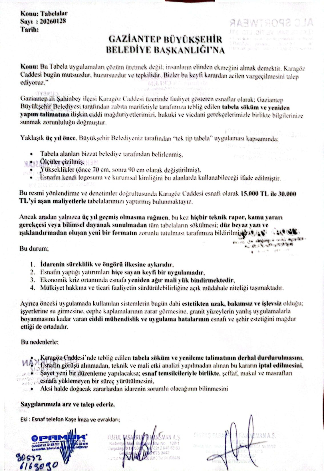 “Yaklaşık üç yıl önce Gaziantep Büyükşehir Belediyesi tarafından ‘tek tip tabela’ uygulaması adı altında esnafa bir düzen dayatıldı. Belediyenin bizzat belirlediği alanlar oluşturuldu, ölçüler çizildi, 70 santim yükseklikten başlayarak her dükkânın cephesi kadar tabela alanı bırakıldı, Bu yükseklik yolda değişti 90cm çıktı ve bu alanlarda esnafın kendi logosunu, markasını, kurumsal kimliğini kullanabileceği söylendi. Bizler de bu yönlendirmeye güvenerek ciddi maliyetler üstlendik.”